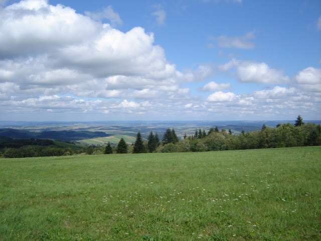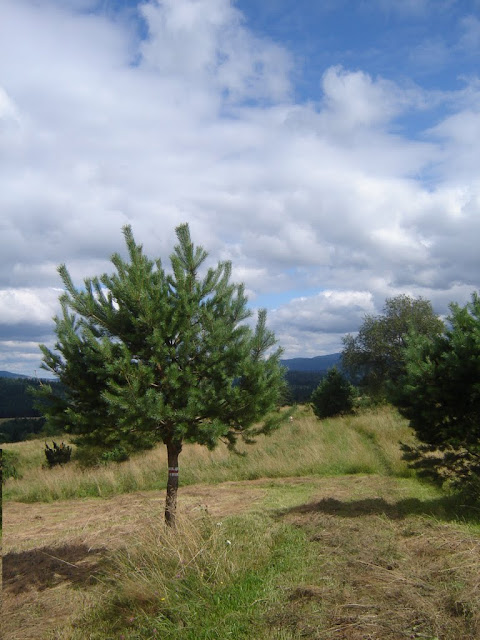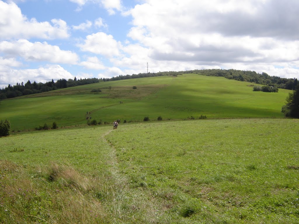 Kolejnym osiągniętym przez nas wzniesieniem był Kamień charakteryzujący się kilkoma naprawdę ogromnymi głazami. Najbliższa okolica była zalesiona, toteż bardzo przyjemnie było po następnych paru kilometrach wyjść na otwartą przestrzeń. Szlak prowadził znów skoszonymi łąkami, które miały w sobie coś magicznego, co sprawia, że chcę tam wrócić. Polne dróżki doprowadziły nas do Wahalowskiego Wierchu, którego najbardziej charakterystycznym punktem jest szatańska wysokość. Nie przeszkadzało to jednak w niczym, by cieszyć się pięknymi widokami.