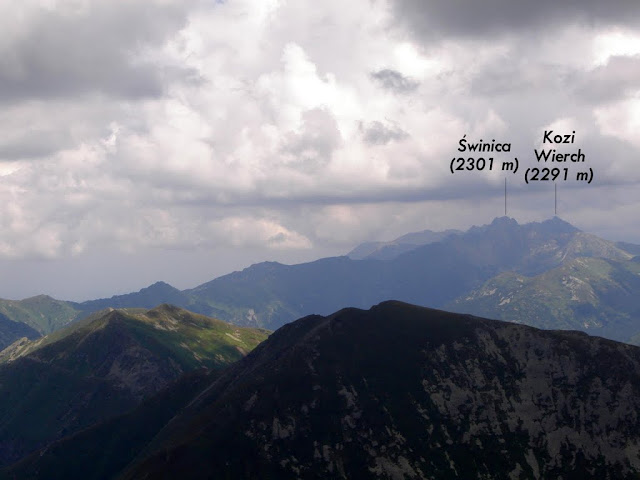 Gdy potok blednie i niknie, perć dźwiga się kilkoma zakosami aż wreszcie osiągnąłem Pyszniańską Przełęcz przez którą przebiega granica. Co ciekawe, wg polskich źródeł ma 1788 m zaś wg słowackich - 1792 m. Wysokość nie jest jednak ważna w porównaniu do pięknych widoków. Przede wszystkim na wprost otwiera się Polska, a dokładniej rzecz ujmując - Dolina Kościeliska otulona wapiennymi utworami. Wzrokowcy na pewno dostrzegą też dach schroniska na Hali Ornak oraz Smreczyński Staw. Ponadto kilka szczytów m. in. Czerwone Wierchy, Kominiarski Wierch oraz Kamienista po prawicy. Nie mogę też pominąć tego co najważniejsze: Błyszcza i Bystrą a więc kolejne punkty naszej trasy. W rejonie przełęczy znajduje się również (w zależności od warunków) kilka do kilkunastu okresowych stawków. Cała panorama już wtedy wywarła na mnie niemałe wrażenie: