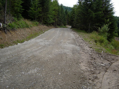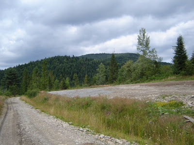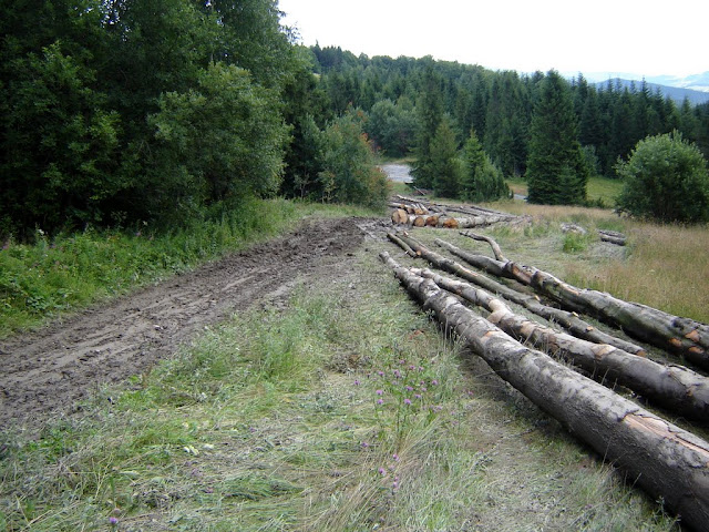 To niestety nie była najgorsza rzecz jaka przytrafiła się podczas tej wyprawy. Wkraczając w las natrafiłem na kompletnie rozjechaną drogą pełną błota, w którym nogi samoistnie się zatapiały. Co gorsza, obok, las gęsto zarastał toteż byłem skazany na istną mordęgę. Klnąc, denerwując i męcząc się, słyszałem w oddali dźwięk spadającego drzewa. Buty co chwila zsuwały się w dół - jeden zły krok i mogłem zażyć obfitej, błotnej kąpieli. Dla mnie osobiście, ten teren kojarzyć się będzie z wielką katastrofą ekologiczną. Szlak został po prostu zniszczony.