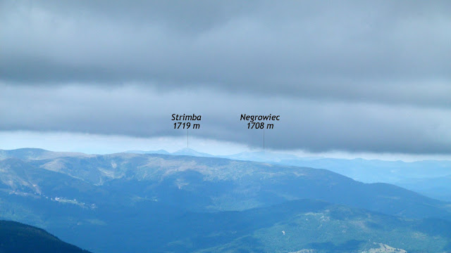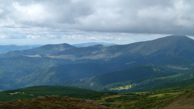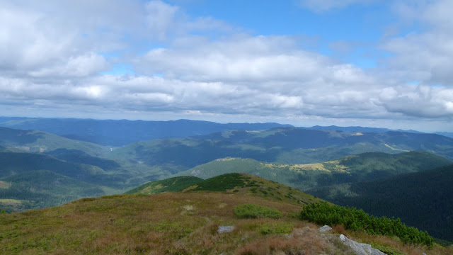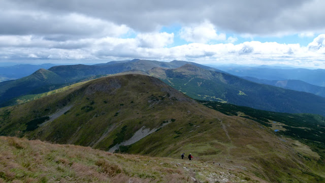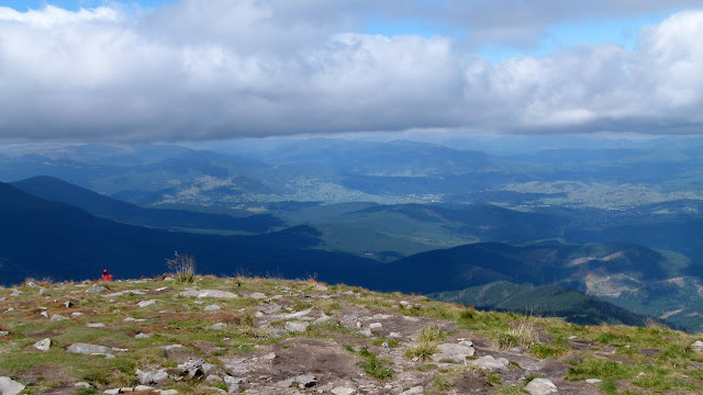 Coś cudownego, nieprawdaż? Trzeba przyznać, że mam ogromne szczęście co do "ukraińskich Rysów". Dwa lata temu również powitało nas słonko oraz widoki rozpościerające się w promieniu aż kilkudziesięciu kilometrów. Ponownie setki szczytów na wyciągnięcie ręki i tylko pytanie jak się one nazywają? Czasu na rozgryzienie panoramy za wiele nie było. Najwięcej pewności mieliśmy do tego, że właśnie widzimy wszystkie dwutysięczniki Ukrainy. Co ciekawe, aż cztery z nich mogliśmy uwiecznić na jednym kadrze. Wszystkie one wyrastają na południe od Howerli wzdłuż grzbietu czarnohorskiego bądź tuż obok niego. Jedynie piąty - Petros - wymagał zwrotu o 180 stopni. Wszystkie spaja czerwony szlak, którym od teraz mieliśmy podążać przez okrągłe sześć kilometrów, aż do Jeziorka Niesamowitego. Ten fragment trasy był dla mnie nowością. Dwa lata temu zeszliśmy szlakiem niebieskim bezpośrednio do Zaroślaka, a teraz trasa choć dłuższa to jednak okazała bardziej atrakcyjna. Sześć kilometrów połonin czyli to co wielu turystów uwielbia w górach najbardziej. W tym czasie stanęliśmy na kolejnych szczytach aczkolwiek nie były to już dwutysięczniki. Jako, że w górach nie lubię się spieszyć, to szczyt opuściłem jako jeden z ostatnich. Nie mógłbym ruszyć w dalszą podróż nie zarzuciwszy jeszcze oka na niepowtarzalną panoramę z Howerli.