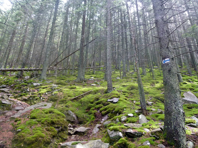W takiej oto zielonej atmosferze osiągnęliśmy przełęcz pod szczytem, która porasta kolejna połonina. Znaleźliśmy się tam zaskakująco szybko, bowiem od charakterystycznego rozdwojenia szlaku upłynęła zaledwie godzinka. Teraz natomiast do samego wierzchołka mieliśmy już tylko ok. 600 metrów czyli dosłownie kilka minutek podejścia. Okolice przełęczy były jednak zamglone, toteż czy cokolwiek ujrzę ze szczytu? - pomyślałem. W takich warunkach ciężko o optymizm.