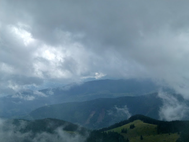 Choć zdecydowanie aura do wymarzonych nie należała to jednak wokół nas rozgrywał się istny spektakl. Poziom zachmurzenia zmieniał się z minuty na minutę, gdyż obłoki całkiem sprawnie pływały nad sąsiednimi górkami. W efekcie, trzeba było uważnie obserwować okolicę, gdyż bywały momenty kiedy w danym kierunku wyłaniało się coś więcej niż tylko najbliższe pasmo. Po porannym deszczu oraz zamgleniu nareszcie mogliśmy spoglądać na rozwój sytuacji z większą nadzieją.