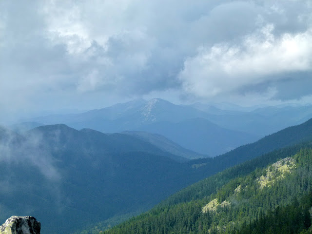 Po około 75 minutach powróciliśmy na siodło pod szczytem. W związku z ustąpieniem chmur miejsce to zmieniło się diametralnie. Okazało się, że zza lasu wystaje sporo okolicznych górek. Choć nie było już czasu na zabawę w rozszyfrowywanie to jednak niewątpliwie piechurkowanie w takim towarzystwie idealnie utwierdzało w przekonaniu, że jesteśmy bohaterami ukraińskiego snu, a każdy kolejny dzień spełnia nasze marzenia.